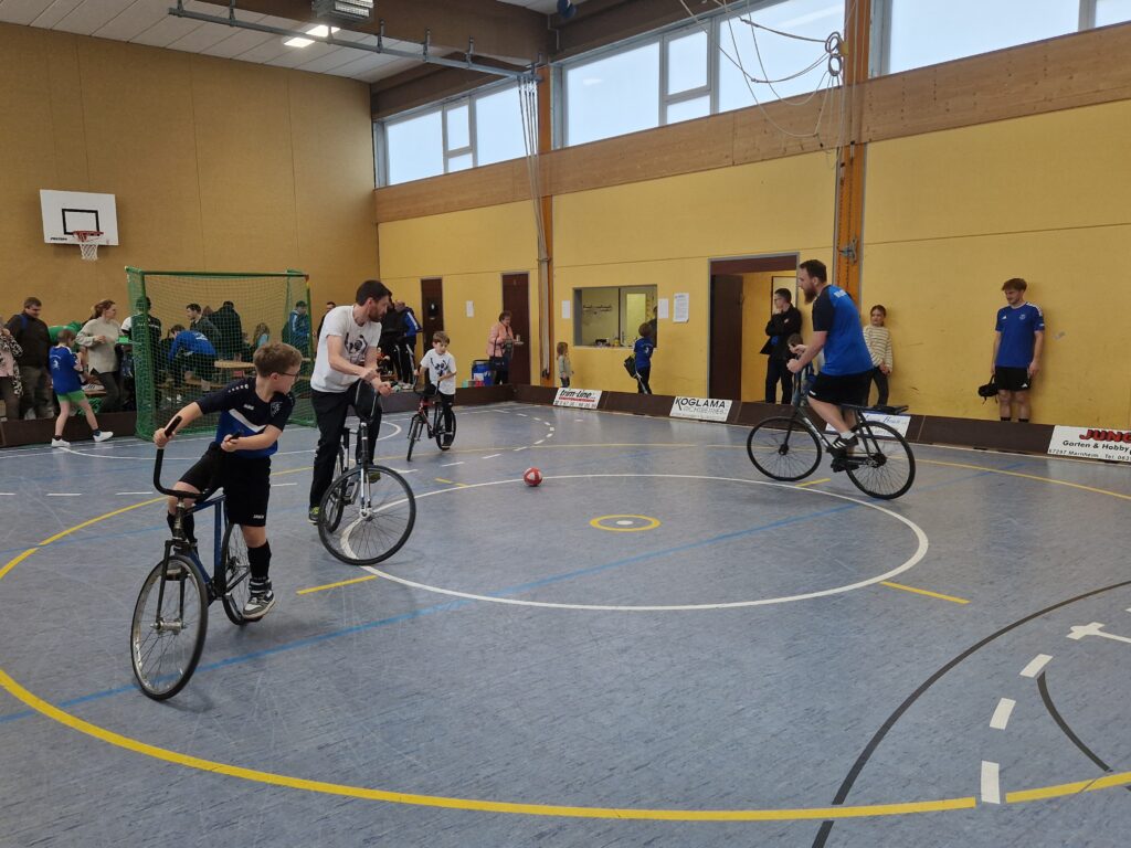 Als kleine Zwischeneinlage zum zweiten Turnier des Tages kam es zu einem Radballspiel der besonderen Art. Denn nicht nur die Bolandener haben mit Tobias und Mio Simon ein Vater-Sohn-Gespann im Training, sondern auch der RSV Waldrems mit Marcel und Felix Bräunling. Somit spielten beide ein kleines Familien-Duell als Überleitung zur Freude aller Zuschauer in der Halle. Das Spiel endete 2:1 für Familie Simon.